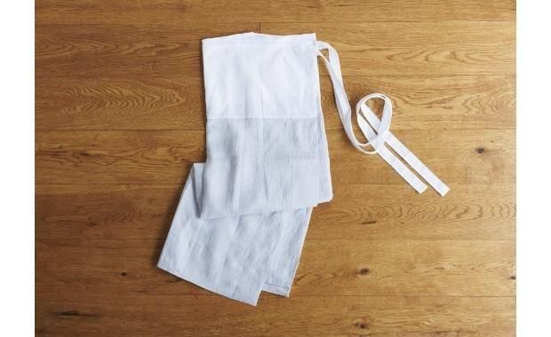真夏の裾よけは、肌に張り付いたり、脚にまとわり付いたり、悩みの種。楊柳仕立ての本麻を使った裾よけならば、さらさら快適。長じゅばんさながらの丁寧な仕立てで、長めに折り返した布の重みで裾がきれいに落ちる。ブルーグレーだから、着物の下からちらっとのぞいても肌着見えしない。腰まわりには上質な特岡さらしを使用。